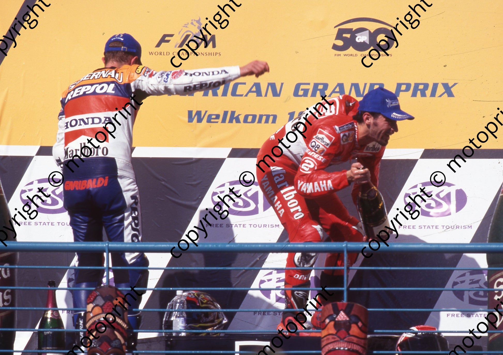 1999 Phakisa SA GP 500 podium Max Biaggi 1st bending, Sete Gibernau 2nd (Watling Photographic) (1)