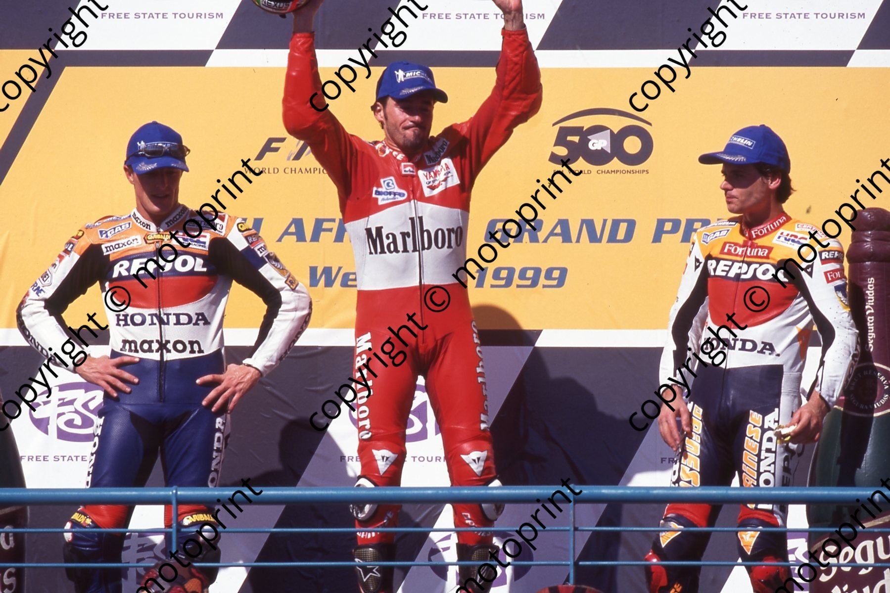 1999 Phakisa SA GP 500 podium Sete Gibernau 2nd, Max Biaggi 1st, Alex Criville 3rd (Watling Photo) (4)