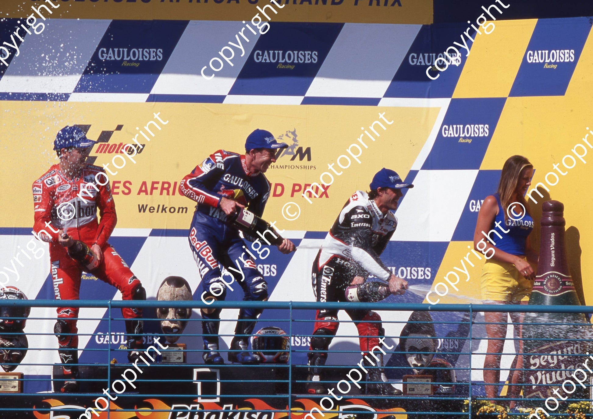 2000 Phakisa SA GP 500 podium Gary McCoy centre, Carlos Checa left, Loris Capirossi right (Colin Watling Photographic) (94)