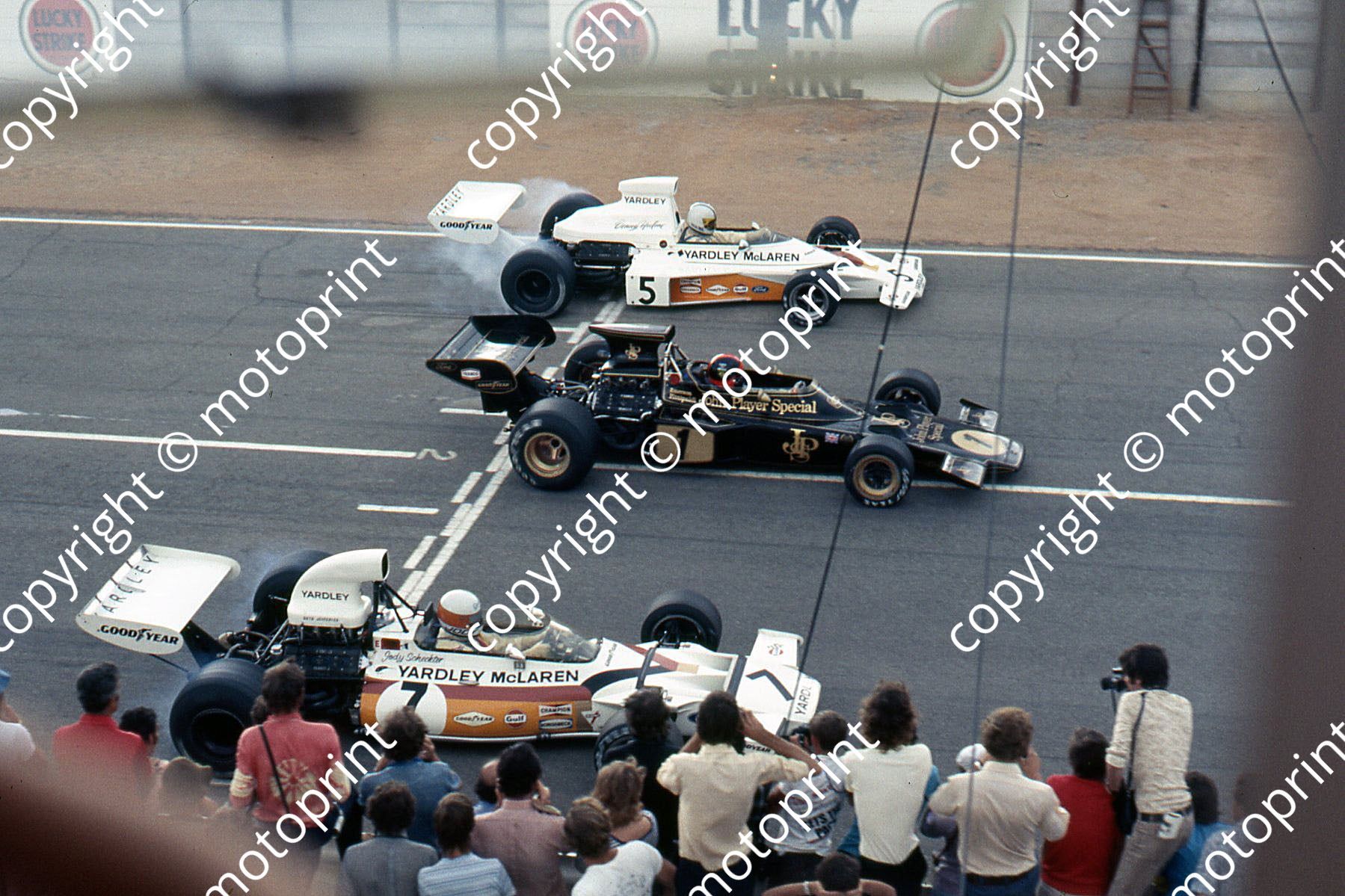 SS Start, Hulme wheelspin, Fittipaldi first, Scheckter some wheelspin